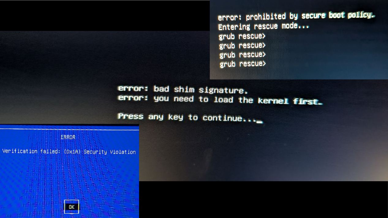 - Lösungsvorschlag: Secureboot im Bios deaktivieren oder einen Bootloader (oder Distro die das Implementiert hat) der Secureboot fähig ist verwenden